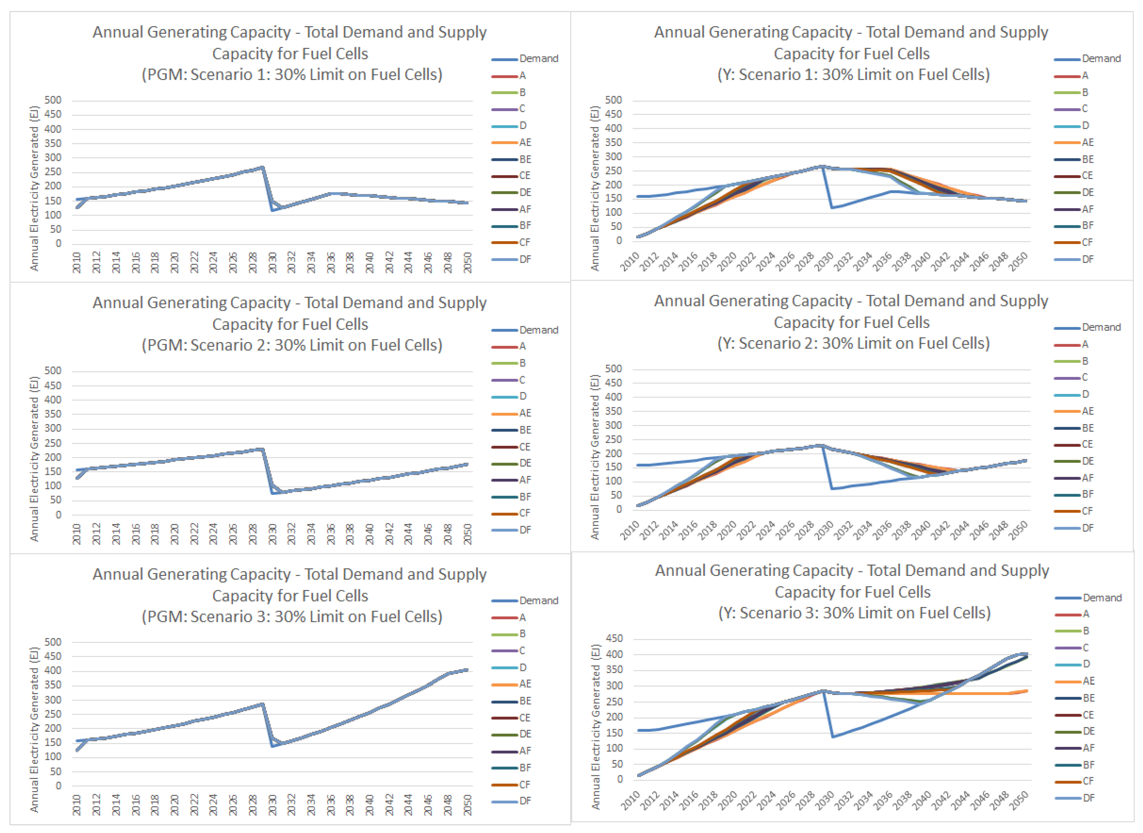 In addition to the scenarios for total energy demand, a number of scenarios were examined for the roll-out of solar photovoltaics, wind power and fuel cells. In the case of fuel cells, a simple percentage of total energy demand was attributed to fuel cell power systems, at levels of 10%, 20% and 30%. In the case of wind power and solar power, historical trends were used to extrapolate future take-up. In all cases, a limit was set on the maximum uptake of wind and solar power, set at 10%, 20% or 30% of the peak annual energy demand for the period out to 2050; once this was attained, it was assumed that this level would be maintained throughout the remainder of the period. The resulting energy demand from solar and wind in the three scenarios is shown in