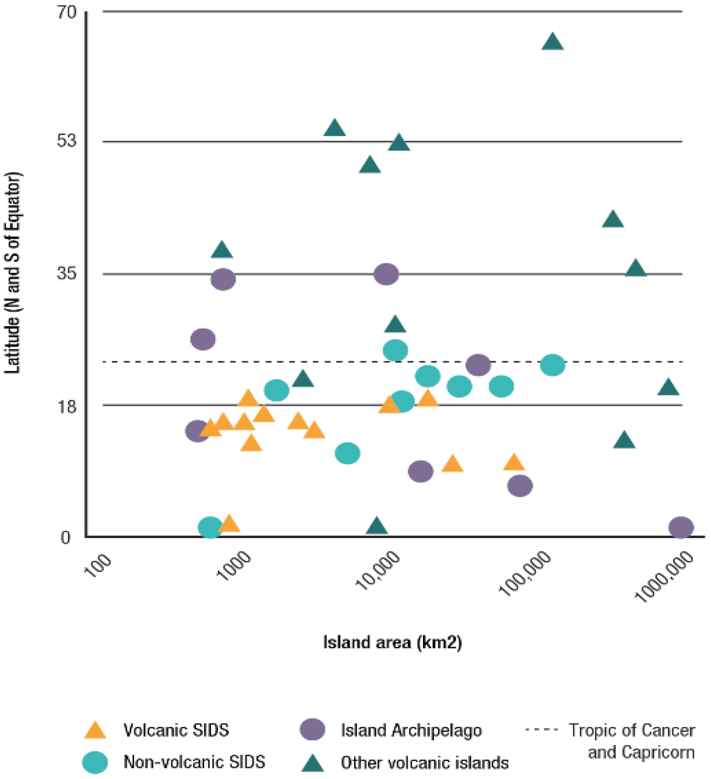 Understanding why levels of disaster risk are so high in SIDS also requires a detailed examination of the geography of these islands and, linked to this, the natural hazards themselves, as well as population exposure and vulnerability. Many SIDS—using the UN definition of SIDS but removing those that are not actually islands (Belize, Guinea-Bissau, Guyana and Singapore)—are located on or near plate boundaries, and they all are found within the tropics, defined as 23°26′ N and S (bounded by the Tropic of Cancer and Capricorn) (Table 1 and Figure 1). Many owe their subaerial exposure to deposits from past volcanic activity, which results in a geomorphologically immature topography, with hills and mountain tops bounded by steep-sided, often unstable slopes. The volcanic SIDS are thus not only prone to storm surge and sea-level rise, in common with the other (more low-lying) SIDS, but are also susceptible to a wide range of geophysical hazards. The contrasting topographic characteristics of volcanic SIDS in relation to other SIDS mean the higher steeper volcanic islands are more prone to landslides (and earthquakes) and just as prone to hurricanes and flash-flooding as other SIDS. However, they may have more land that is removed from the impacts of storm surge and sea-level rise. The options for disaster risk-sensitive development in these two types of SIDS could be very different. In this paper we examine the development challenge posed by the first type: the steep volcanic SIDS.