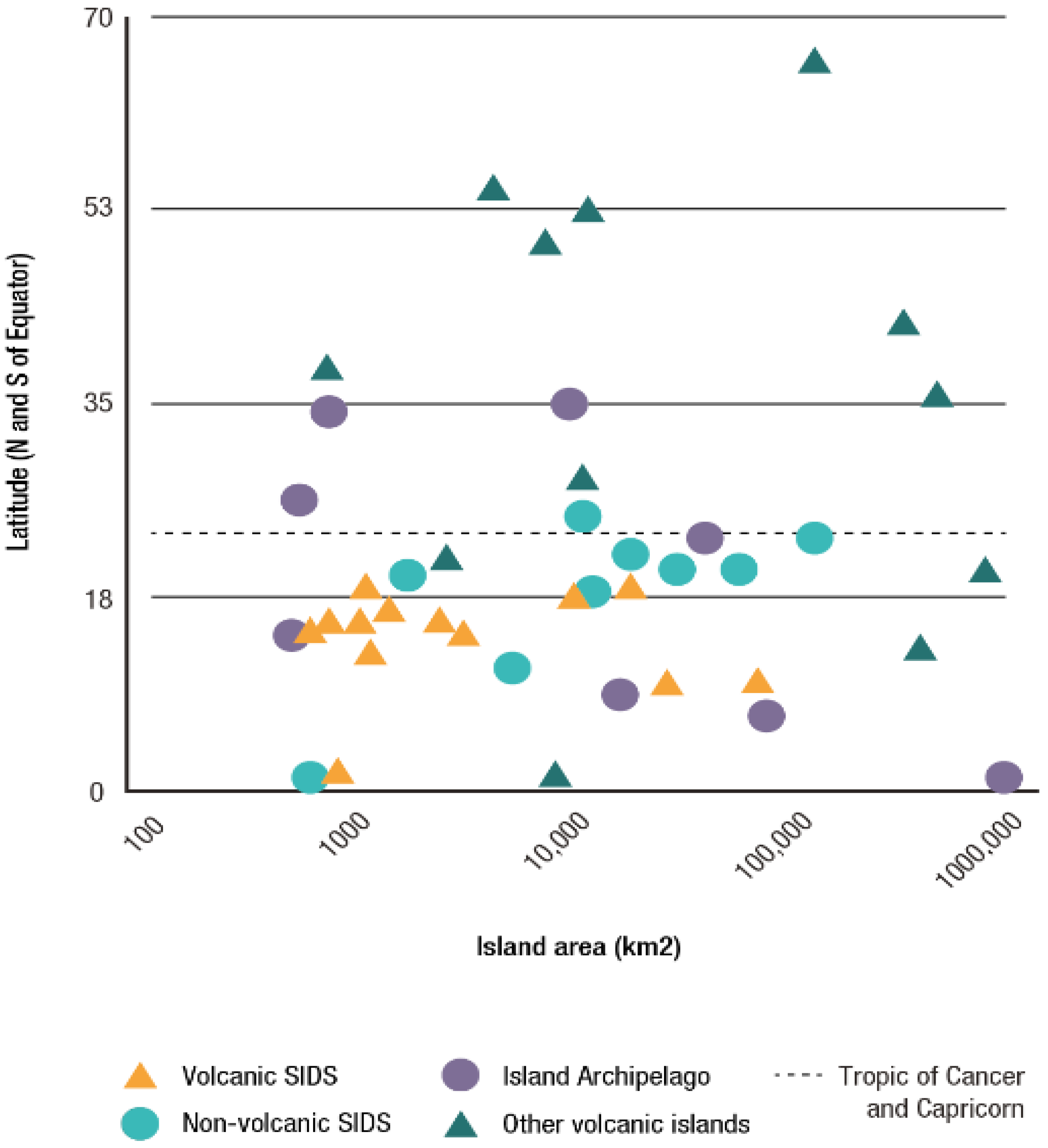 Islands nations of the world plotted by Latitude (in degrees North and South of Equator) and total land area (km2). Dashed line represents the location of both the Tropic of Cancer and the Tropic of Capricorn.