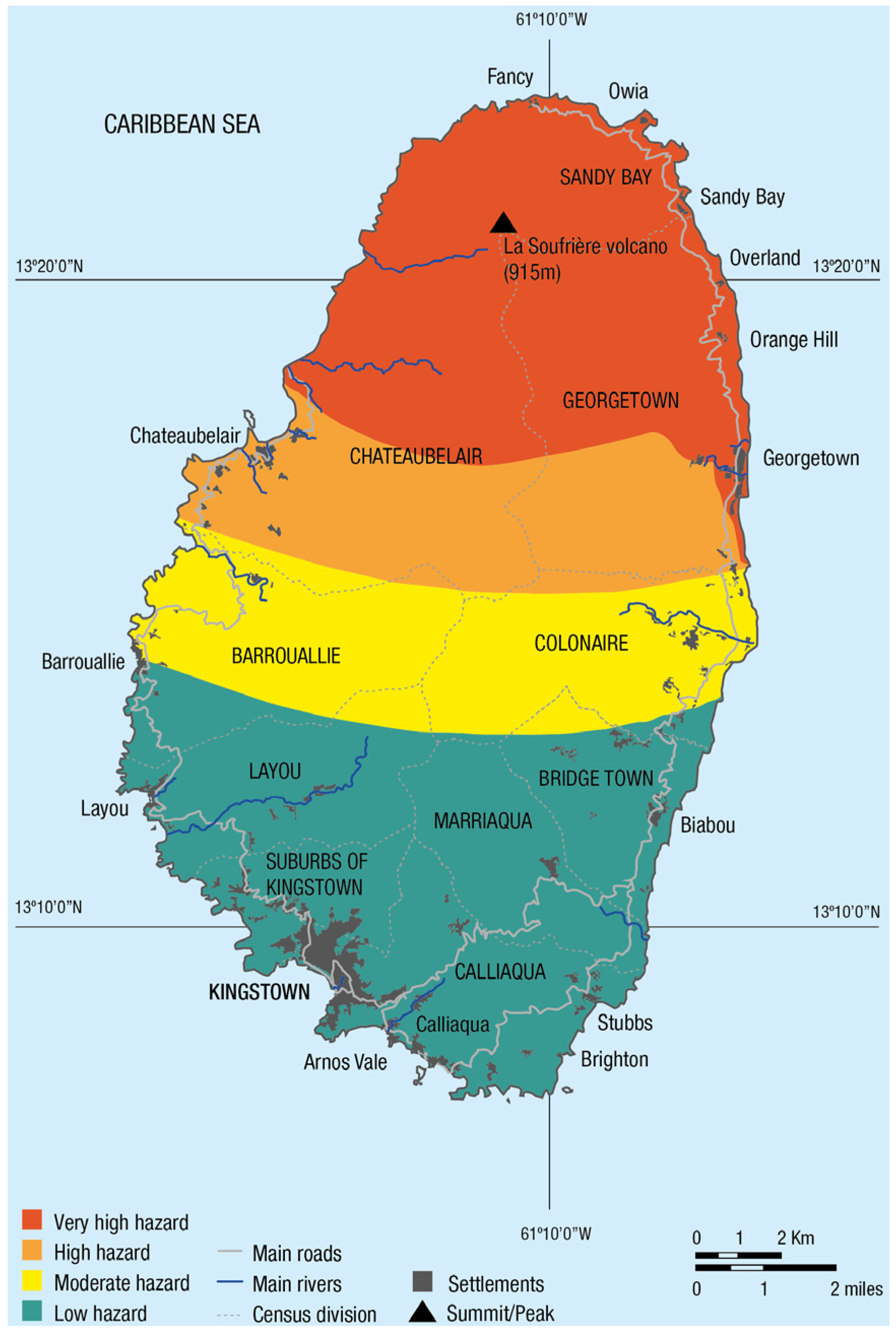 Close to 15% of the population of SVG today lives in the very high- and high-hazard areas on the volcano hazard map (based on 2012 population data for the Georgetown, Sandy Bay and Chateaubelair districts). According to the work of Boruff and Cutter [28], the size of the population exposed to volcanic risk in SVG is second only to that exposed to landslides, with an estimated 78% of the population at risk; only 4% of the SVG population lives in flood-prone areas. However, a recent, more detailed, analysis of hazards on behalf of the World Bank reveals a greater susceptibility to landslides, a larger population exposed to flooding and a significant threat from coastal erosion [50].