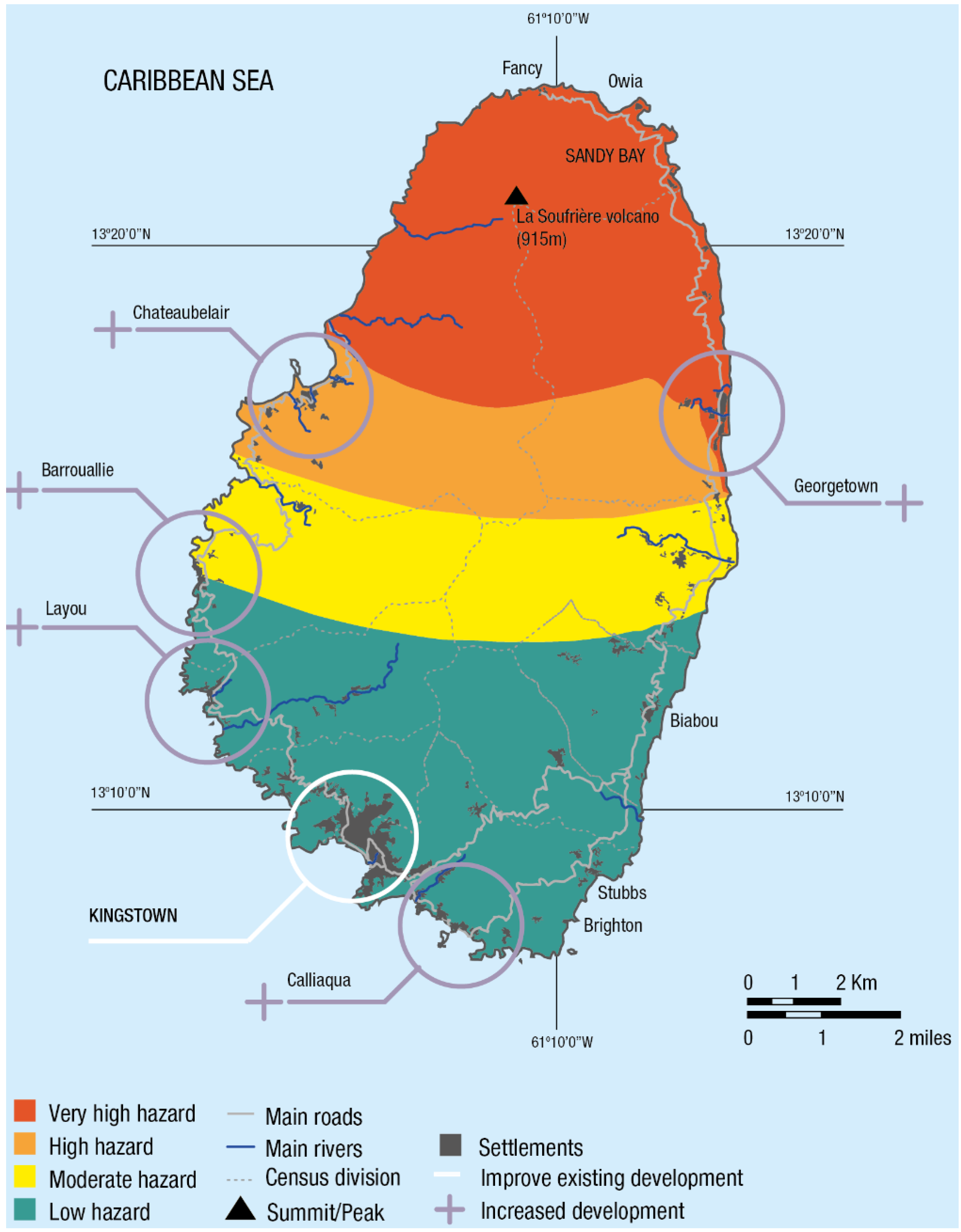 Before the eruption of 1902, the population of SVG was dispersed through the country, with many workers on the large estates in the north of the country, including areas that now fall within the very high- and high-hazard zones. Georgetown was an important economic and population centre under British rule, but economic activities were in decline and poverty rates high because of a struggling sugar industry and neglect by absentee landlords. The UK government responded with a Road and Lands Settlement Fund [52]. Much of the indigenous population also resided in the very high-hazard zone, having been pushed onto increasingly marginal land as a result of the development of large plantations through the 19th century. The focus of this was the acquisition of land to encourage smallholdings, livelihood diversification and the improvement of infrastructure, but its dispersal was interrupted by a hurricane in 1898 and the volcano in 1902 [52].