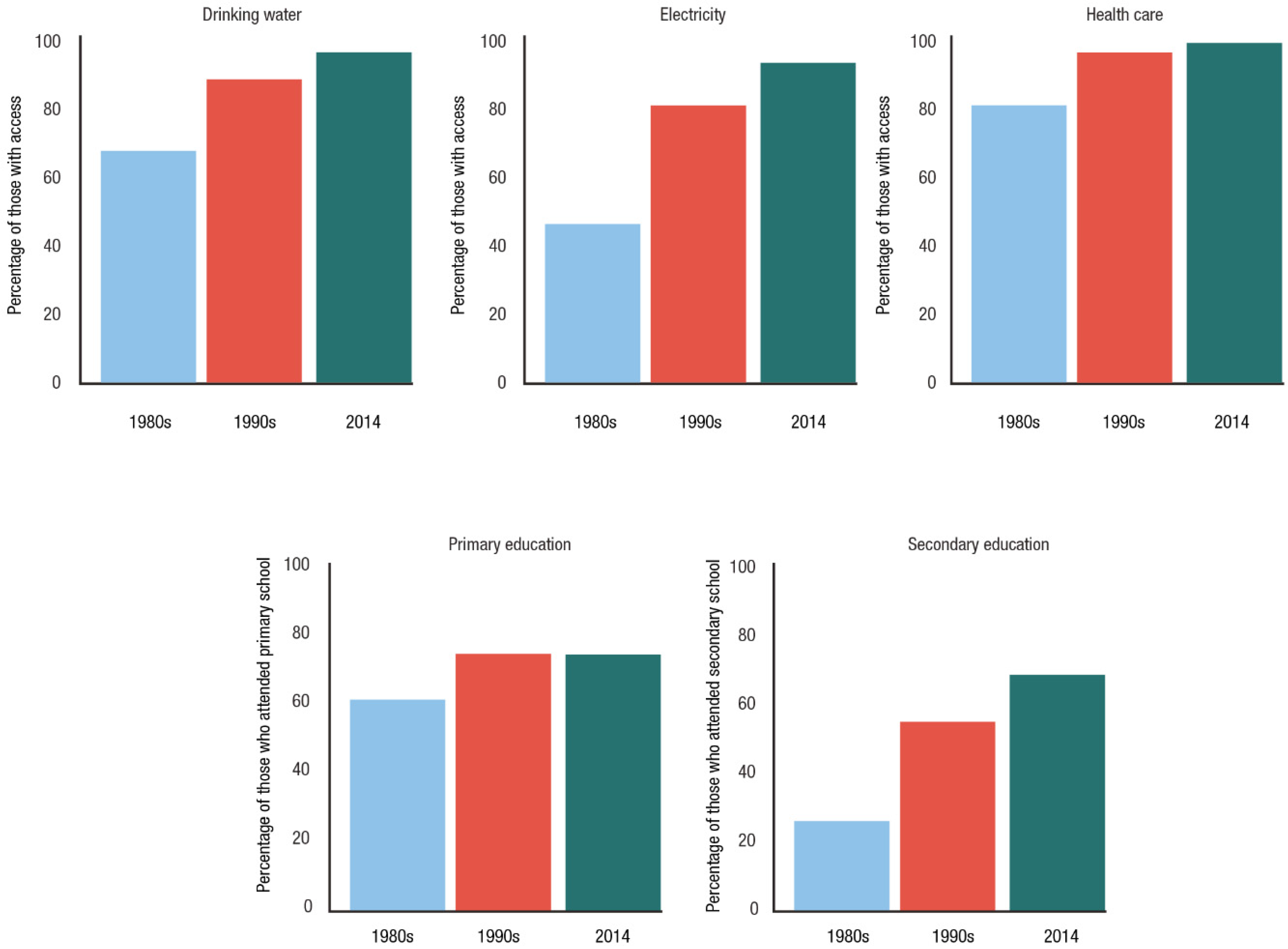 Census data confirm that populations located close to the volcano have benefited from these investments. Close to 100% of all survey respondents in Georgetown and Sandy Bay in the very high-hazard zone and Chateaubelair in the high-hazard zone have access to almost all basic services (see Figure 4). Electricity and secondary education have seen the most important changes since 1979.