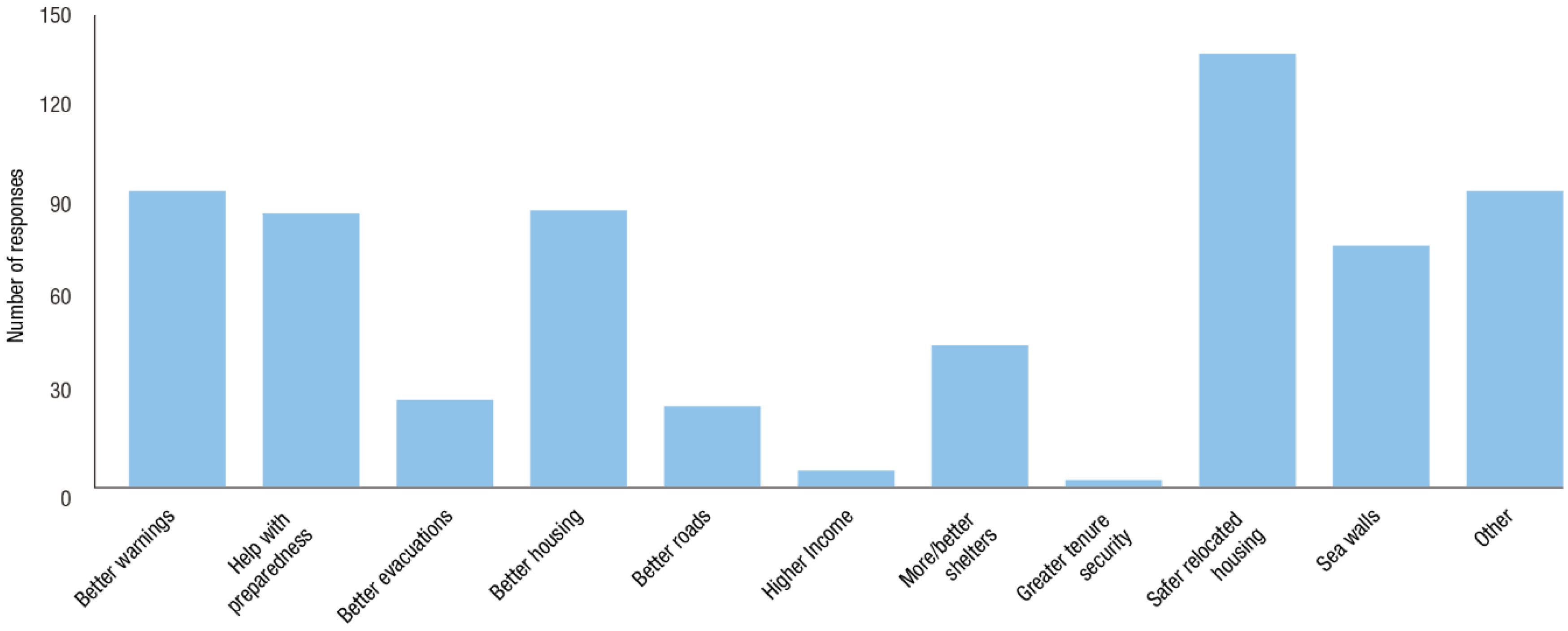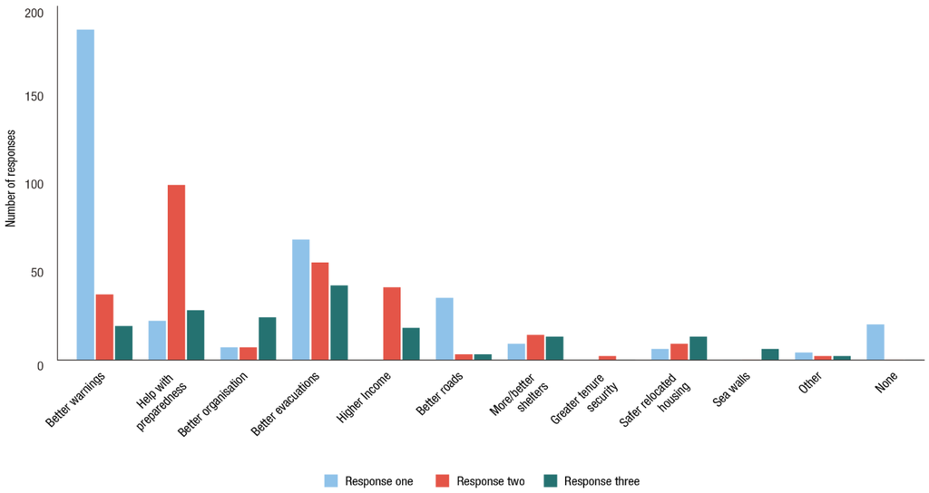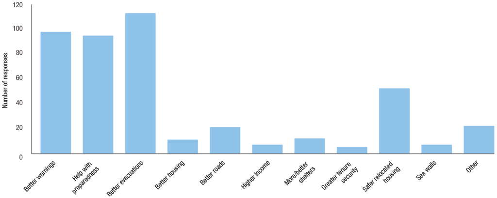 When asked about the changes needed to reduce the impact of storms and volcanoes in the future (Figure 6 and Figure 7), there were fewer responses for volcanoes than there were for storms. Nonetheless, the fact that well-organised evacuations featured in 22% of answers shows respondents had some awareness of issues around volcanic eruptions. With regard to storm impacts, respondents focused more on reducing exposure, with 34% considering housing relocation to safer areas as the best option, 21% “better warnings” and 23% “help with preparedness” or “other” as useful.