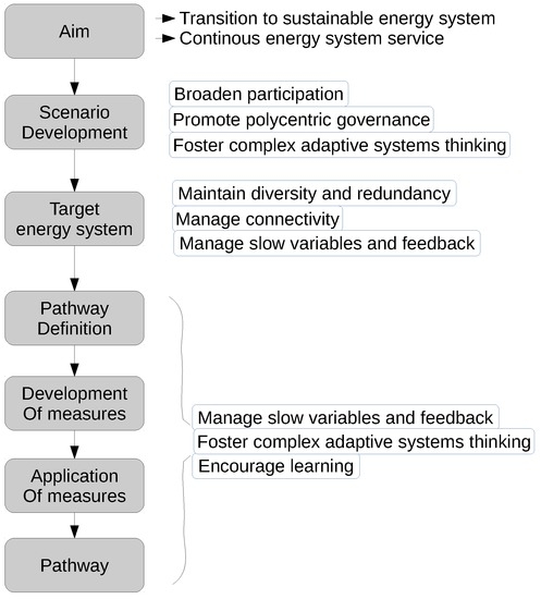 Energy system transition process (gray boxes on the left) based on backcasting and possible supporting resilience thinking principles (white boxes on the right) at different parts of the process.