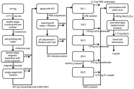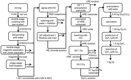 In an aging process, the concentrate is mixed with hydrochloric acid [29]. To prevent gelation, every mineral particle must be moisturized with acid. Gangue and minor elements are separated by washing and filtration. Adding lime milk to the filtrate, to adjust to a pH of four, causes iron, zirconia and aluminum separation. After that, several solvent extraction steps are necessary to separate each REE. For calculation, nine real solvent extraction steps (SX) are aggregated to 5 SX to reduce the complexity of modeling. The extraction process and the chemicals used are based on industrial extraction processes [45] and are adapted to the REE composition in eudialyte. As extraction agents, amines and phosphoric acid substituted by organic ligands are used. The subsequent precipitation is carried out using oxalic acid in the case of a Nd and soda in the case of a Dy process chain. The resulting oxalates and carbonates are then calcined in a tunnel furnace at 900 °C. The combustion is calculated in ASPEN PLUS® (Aspen Plus® V8.6, Aspen Technology, Bedford, MA, USA). For Dy production, thermal decomposition, leaching of heavy rare earth oxide with hydrochloric acid and further solvent extractions to separate Dy from other HREEs are assumed [29].