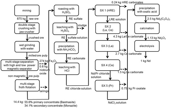 The crushed ore is transported 150 km by train from the mine at Bayan Obo to the processing plant at Baotou. There, it is ground to a size of <74 µm by conventional wet grinding with an integrated hydro cyclone classifier [58]. Separation of ferrous magnetite is carried out by low and high power magnetic separation. The ore pulp of magnetic separation passes through a multi-stage flotation resulting in a bastnasite and monazite concentrate with 55.6% and 34.1% REO, respectively [28]. The yields for bastnasite and monazite concentrate amount to 12.6% and 6%, respectively [58].