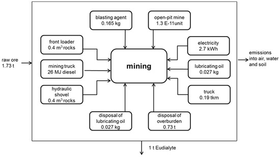 According to all assumptions and data, each single process/box in Figure 1, Figure 2, Figure 3 and Figure 4 is modelled analogously to Figure 5, serving as an example for all other single processes/boxes. In Figure 5, all inputs necessary for the mining process are shown. As outputs and all emissions into the environment are accounted for. Inputs and outputs are related to the main output of this specific process (here, 1 t eudialyte mined). In this example, for the mining of 1 t eudialyte, 0.156 kg blasting agent, 2.7 kWh electricity, 0.19 tkm by truck, 0.4 m3 rock transported by front loader and hydraulic shovel, etc., are needed (Figure 5). Afterwards, all single processes are combined to an entire process chain, and all inputs and outputs are added accordingly using GaBi6.