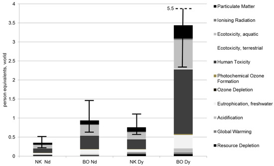 The gathered inputs and outputs are allocated to specific environmental effects. To classify the importance of various effects, each is related to the average annual share a person contributes to this environmental impact worldwide, in the normalization step. Hence, Figure 6 shows the summarized results for each production chain in terms of normalized impacts (inclusive error bars; see Section 6, Table 10) in person equivalents related to the functional unit. The production of Nd and Dy at Norra Kärr is much less polluting than at Bayan Obo, although the amounts of raw ore needed per kg Nd and Dy are higher at Norra Kärr (Figure 1, Figure 2, Figure 3 and Figure 4). The impacts for the Swedish Nd production only amount to approximately 40% of the impacts occurring at Bayan Obo. Especially for Dy, the results of production at Norra Kärr show a considerable advantage against production at Bayan Obo due to the higher content of HREEs in the eudialyte mineral. The impacts for the Norra Kärr Dy production only amount to approximately 20% of the impacts of Bayan Obo.