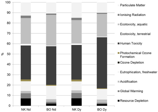 If the values are plotted in relative numbers (%) (Figure 7), the importance of different environmental impacts becomes even more visible. The crucial impact categories are human toxicity, ecotoxicity (aquatic), particulate matter and eutrophication followed by resource depletion and global warming at both production sites (Figure 7). The share of human toxicity amounts to 33%–49% of the total impacts. Human toxicity is predominately caused by emissions during the production of chemicals (e.g., hydrochloric acid, hydrofluoric acid, extracting agents) used for aging, precipitation and solvent extraction. Furthermore, heavy metal emissions into water during waste water treatment and hydrofluoric acid emissions during the production of DyF3 contribute to this effect. The latter are much lower for Dy production in Sweden due to an assumed enhanced flue gas cleaning during DyF3 production.
