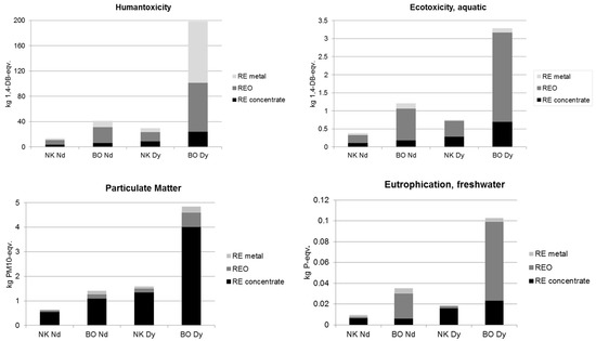In LCI, the main energy and material inputs and outputs are summed up (selected inputs and outputs in Table 8) after every single process of Figure 1, Figure 2, Figure 3 and Figure 4 has been assembled with corresponding data. The values for the two REs, as well as for both production sites are very different regarding the amounts and types of material and energy necessary. For example, the Dy production at Norra Kärr uses the highest amount of energy resources, process water, caustic soda, hydrochloric acid and transport service due to the highest amount of raw ore mined (allocated as described above). The high process water amount at Norra Kärr is mainly related to data from an up-scaled laboratory facility, with no recycling. However, for a large-scale site, recycling is expected. On the other hand, most of the emissions released have their highest values at Bayan Obo (e.g., HF, non-methane volatile organic compound (NMVOC), heavy metals into air, radioactive emissions into air) due to poor process control, as well as hardly existing waste and sludge treatment. Due to the roasting process, the facilities at Bayan Obo use great amounts of sulfuric acid, but lower amounts of hydrochloric acid than at Norra Kärr. However, hydrochloric acid is the main input at Norra Kärr due to the aging process instead of roasting. The amount of lithium fluoride (LiF) is almost 1000-times higher for Nd production in Bayan Obo than at Norra Kärr due to the assumed better process control and re-use of LiF and NdF3 by dust recycling during electrolysis at Norra Kärr. Ammonia, calcium chloride and calcium are mainly used for the production of Dy fluoride and reduction to Dy. Therefore, the amounts of these three chemicals are higher for Dy production than for Nd. Altogether, almost all inputs and outputs for Dy production are higher than for Nd following the allocation described above.