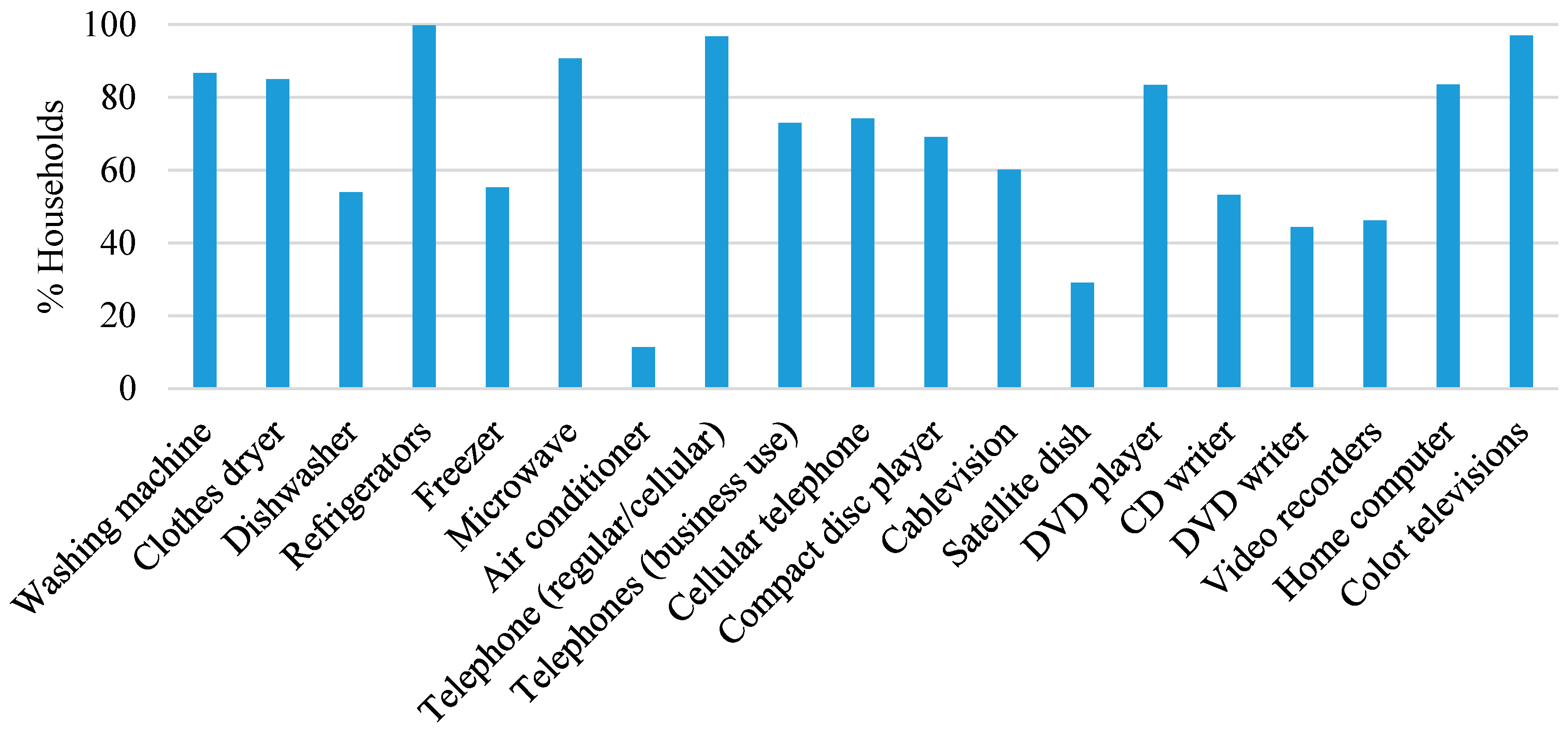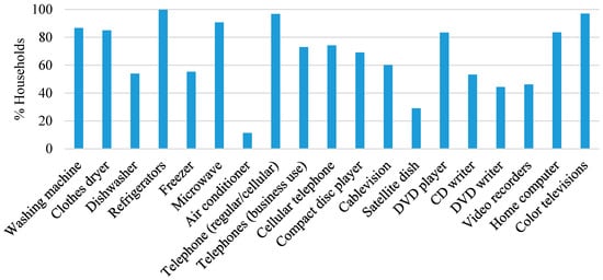 The average penetration of electrical and electronic products in the Canadian household is shown in Figure 4 []. The figure showed that almost all households in Canada rely heavily on electrical and electronic equipment. In the 13,320,610 households in Canada surveyed in 2011 [], approximately 172 million items of household equipment were in use by 2012.