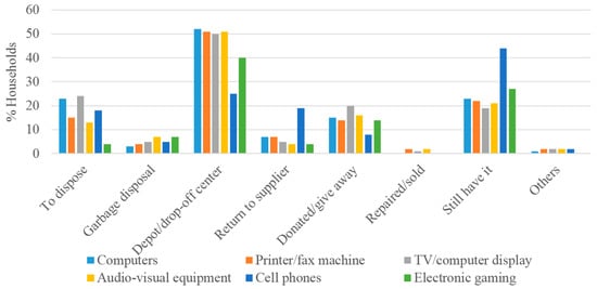 Figure 6 shows the general trends in disposal practices followed by Canadian households for various e-waste items []. It shows that the households are more likely to send the waste to a drop-off center or depot, which is then either sent to landfill or recycling. The figure also shows that there are approximately 20%–25% households that still have the e-waste. This might be due to lack of awareness regarding disposal methods or unavailability of a drop-off center.