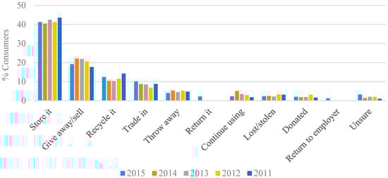 Figure 7 represents the consumer behavior regarding cellphones, based on survey data from the Canadian Wireless Telecommunication Association []. It shows that consumer behavior has not changed much in the last five years.