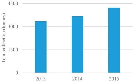 CESA is a non-profit organization established in 2010 to develop a recycling program to manage end-of-life products like various small household appliances and power tools. CESA is currently managing the recycling program ElectroRecycle in British Columbia []. Figure A1 shows the total end-of-life electrical products collected by ElectroRecycle in British Columbia. The rise in collection is due to easier access to a drop-off location and increased awareness. The number of collection sites increased from 162 in 2013 to 197 in 2015.