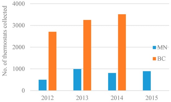 Scout Environmental is a non-profit organization that develops and implements product stewardship and waste management, especially in the automobile sector. It works in the field of recycling end-of-life vehicles, removing and managing mercury-containing light switches and anti-lock brake systems []. In the field of electronic waste, the Switch the ‘Stat program initiated by Scout Environmental in 2006 is focused on recovering and managing old thermostats and removing mercury from e-waste in British Columbia and Manitoba. On 1 July 2016, the Heating, Refrigeration and Air Conditioning Institute of Canada (HRAI) launched a Thermostat Recovery program to replace the Switch the ‘Stat program in most of the provinces. Figure A2 shows the equivalent number of thermostats collected in British Columbia and Manitoba under the Switch the ‘Stat program. The data for 2015 in British Columbia are yet not available.