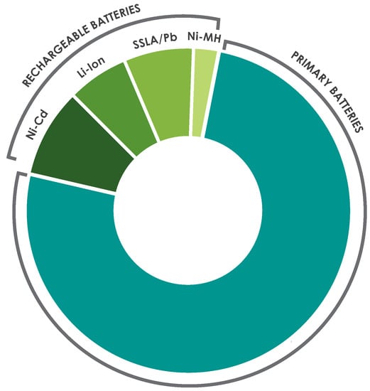 The amount of batteries collected in Canada reached 2500 tons in 2015 compared to 2286 tons in 2014, which includes rechargeable and non-rechargeable batteries []. Figure A3 shows the different types of batteries collected by the Call2Recycle. It suggests that primary (non-rechargeable) batteries are the major portion of total batteries collected and recycled.
