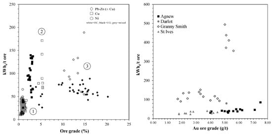 The electricity intensity use, kWh/t ore as a function of the ore grade, for all the commodities is represented in Figure 1. In the left diagram, there are two series of data sets, as the copper mines usually have lower average ore grades than the lead-zinc mines. There seems to be a link between the amount of electricity used per tonne of ore mined in open cut and underground mines, as the latter increases when the ore grade decreases. In the case of mines that have both open cut and underground facilities, represented in grey in the figure, the data are quite clustered in the lower part of the diagram, and this decreasing tendency is not clear. However, this could be easily explained by the way each mine reports their data as data from underground and open cut mines are reported together and both have very different electricity requirements. Usually, considering the extraction process, underground mines are more intensive in electricity than open cut mines because of mine depth and ventilation [40]. Still, open cut mines have also a considerable amount of electricity demand and it has not been possible to assess the percentages that correspond to each facility in these set of data. Regarding electricity use and type of process configuration, the dependency is not very clear when analyzing the data but there are many other factors that could be influencing this, from each individual process to the equipment used. For instance, in the case of Sepon mine (Laos), the electricity consumption per tonne of ore is very high, and in 2014 more than 20% of the total energy used by the mining company was consumed at this facility (MMG Limited). Sepon mine has unusual extraction and processing methods, as after the ore is extracted, crushed and milled, the ore is directly leached without undergoing any concentration process.