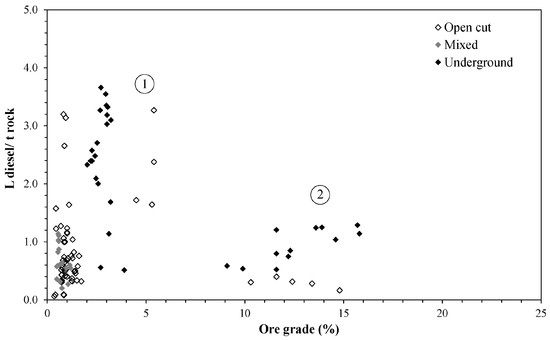 Diesel intensity use, in liters of diesel per tonne of rock mined, is represented in Figure 2 as a function of the ore grade. Usually diesel is used in mines for transport and machinery and sometimes for electricity production. In the case of diesel used for transport there are two main distinctions, diesel used for transport inside the mine and diesel used for transport outside the mine, although the reports rarely differentiate between each different use in the mine. This could become significantly relevant in the case of older mines, as trucks have to go deeper and further.