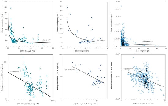Figure 3 shows the trends of total energy consumption as a function of the ore grade, along with the concentration energy (in GJ/t), for the different mines and commodities (Figure 3a: copper, Figure 3b: zinc, Figure 3c: gold); for clarification purposes, these figures are also represented in log-log scale (Figure 3d–f). New data from the gold mines as well as data from previous papers [41] are presented in Figure 3c. It can be observed that the general trend is that the energy consumption increases when the ore grade decreases. Using this information, the average total energy consumption to extract each commodity can be calculated, being 28.2 GJ/t, 11.03 GJ/t and 145,888 GJ/t for copper, zinc and gold respectively.