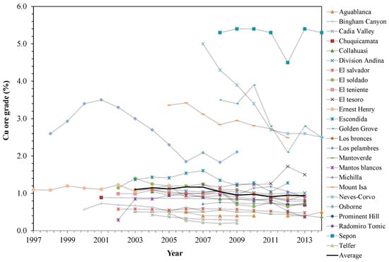 - Northey, S.; Mohr, S.; Mudd, G.; Weng, Z.; Giurco, D. Modelling future copper ore grade decline based on a detailed assessment of copper resources and mining. Resour. Conserv. Recycl. 2014, 83, 190–201. [Google Scholar] [CrossRef]