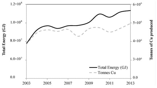 It remains clear that the total energy consumed in the copper mining projects included in this study as well as the tonnes of copper produced increases over time. In the case of total energy consumption, there is a 46% increase from 2003 to 2013. Additionally, there is a 30% increase of copper produced. Although there is a relationship between increases in production and increases in energy consumption, in this case the first factor increases more acutely than the latter. This general increase is distinctly linked to the exponential extraction that can be observed at a global level, as more energy is needed to produce the minerals to meet society’s demands. Additionally, the decrease in ore grades observed before for those same mines also entails an increase in energy consumption, as more gangue mineral has to be removed from the ore to produce the same amount of concentrate. In the specific case of the mines analyzed, it has not been possible to compile enough information on waste rock and tailings, so the information is representative enough. However, for instance, in the case of copper, there is a clear tendency between decrease of ore grade and increase in waste rock [43]. Therefore the three factors analyzed in this paper, energy consumption, ore grade and production, are closely linked and strongly influence each other.