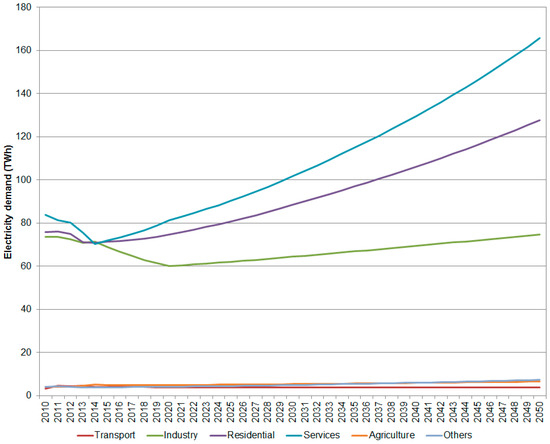 According to Figure 2, a relatively high increase in electricity demand is observed for the services and residential sectors. This is mainly due to the assumed influence of GDP on their performance. As a baseline projection, electricity demand for transport does not consider the penetration of electric vehicles in Spain because of the current lack of policy targets in this regard.