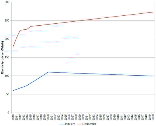 Electricity prices are projected following the trends observed in Capros et al. [29] and adapted for Spain (Figure 3). Different electricity prices are considered depending on the type of user (industrial/residential). Transport and services sectors are assumed to pay as industrial users, whereas the agricultural sector is assumed to pay as residential users (based on the average power requirements of each user).