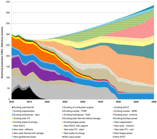 Figure 5 shows the resulting electricity production mix in the reference scenario. A progressive disappearance of the existing technologies is observed. From 2010 to 2015, all values are statistical, thus showing the effect of the financial crisis on the real electricity production and demand. As a result of the decoupling effect between GDP and electricity consumption, a decreasing trend in the electricity production is found in the period 2013–2015 (taking into consideration that the Spanish net power import/export balance means less than 4% of the total gross electricity production). Then, techno-economic optimisation begins and new technologies emerge in order to satisfy the increasing electricity demand. Coal thermal plants are assumed to disappear based on a national plan for the removal of subsidies to the Spanish coal by 2018. After 2015, NGCC plants start being relevant, accounting for 50–60 TWh per year until the end of their lifetimes by 2035. Besides, the nuclear withdrawal takes place progressively, with the last nuclear plant closed down by 2028 (further licence extensions are not considered). Hydropower facilities provide a continuing amount of electricity (20–40 TWh) and, due to their long lifetime, they are assumed to last until the end of the time horizon. Finally, existing wind onshore facilities account for up to 50 TWh per year, showing a decreasing trend until they are upgraded around 2030.