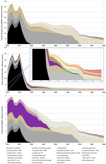 Figure 8 shows the evolved profile of the life-cycle indicators in the CCS scenario. Regarding the existing technologies, the evolution of the three damage categories shows the same trend as in the reference scenario. On the other hand, regarding new technologies, the assumed restriction—no new fossil technologies beyond 2030 unless CCS is deployed—leads to rule out (among others) new cogeneration plants and thus to an increased contribution of the new NGCC plants with capture to all damage categories, especially to the resources category due to the energy penalty of the CO2 capture technology. Nevertheless, despite the higher presence of new NGCC plants with capture, the restriction on fossil-based technologies makes the model install more renewable power plants, enhancing the damage profile of this scenario (especially beyond 2040) and suggesting the preference for renewables over fossil technologies with CO2 capture under sustainability aspects.