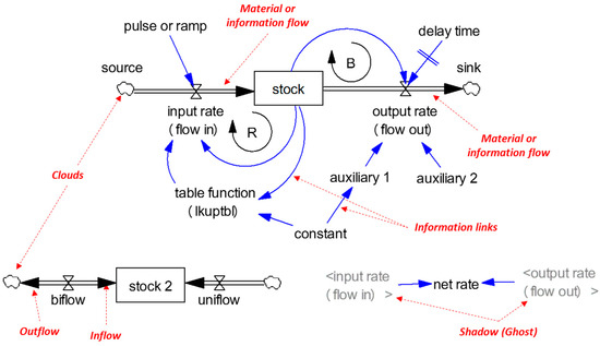 Icons used in system dynamics programming. Stocks represent accumulations (expressed mathematically as integrals). Inflows and outflows change the level of the stock over the given time-step and are influenced by current system stock levels, auxiliary functions (which can take on any large number of potential mathematical functions; e.g., pulses; ramps; graphical or table; etc.), and delays, each connected through an information link. Clouds represent the model boundaries (i.e., sources and sinks), while shadows represent variables used in one location that have been formulated in another. The “R” symbol represents reinforcing (or positive) feedback (also denoted “+”) while the “B” symbol represents balancing (or negative) feedback processes (also denoted “−”). Here the Vensim PLE program (Ventana Systems, Inc., Harvard, MA, USA) is used, although there are some different SD programs available (e.g., iThink; STELLA; Powersim Studio; AnyLogic; etc.).