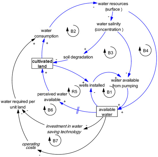 Feedback loop structure of cultivated land in the Yaoba oasis region, constrained by water availability, salinity, and well discarding (negative/balancing feedback loops B1–B4) and perpetuated by delayed perceptions of water availability (positive/reinforcing feedback loop R5), with potential leverage points (negative/balancing feedback loops B6 and B7); adapted and modified based on [56]. The common “fix” (installing more wells to pump water) eventually “backfires” as the perceived water availability outpaces actual water available, further developing more land in cultivation.