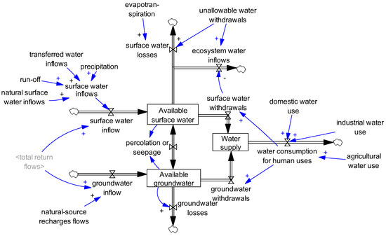 Hydrology sub-system similarly adapted and simplified from [65], displaying natural and anthropogenic-driven water flows, including domestic, industrial, and agricultural water demand that drives inter-basin transfers from surface water, further developing the watershed and ultimately total water demand.
