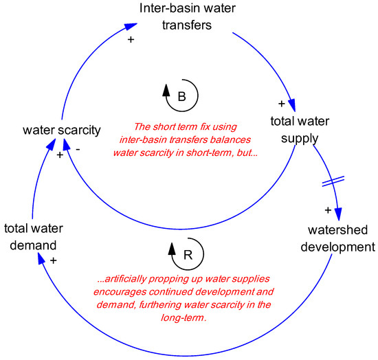 “Fixes that backfire” archetype identified by [65]. The “quick fix” of delivering inter-basin transfers alleviates (or balances) water scarcity in the short-term, but makes it worse in the long-term by encouraging (or reinforcing) watershed development. Adapted and expanded based on [65].