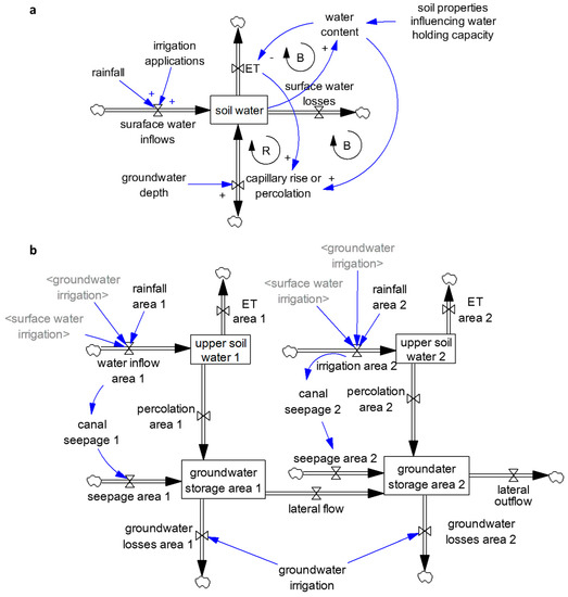 Soil management at the soil layer scale with groundwater interactions: Due to the complex nature of water behavior in soils, managing irrigation water can be challenging due to common unintended consequences, including soil salinity issues as well as water table reductions due to reliance on pumping. In order to better understand the complex (nonlinear) interdependent relationships throughout the soil profile affecting soil water storage and the agricultural system, researchers developed a two-part SD model of soil-water-plant relationships with a dynamic link for interactions with the shallow groundwater table to account for natural recharge as well as pumping [89]. The surface layer model (Figure 5a) consisted of two balancing loops (ET → soil water content drawdown → reduction in ET; water content increase → percolation → reduction in soil water at surface) and one reinforcing loop (ET → capillary rise → soil water content → ET) around the soil water stock, while the surface-ground water interaction incorporated seepage, percolation, and lateral flows (Figure 5b). The model was then used to understand supplemental irrigation in aerobic rice systems, and demonstrated various water table drawdowns depending on irrigation application and groundwater abstraction rates. Because maintaining a sustainable groundwater resource is critical to sustainability, increasing irrigation applications can result in a “fix that backfires,” since continued irrigation applications may draw down the water table to the point that maintaining irrigation is too costly for the agricultural system.