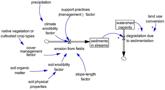 Land management and soil erosion case 1 Alqueva, Portugal: The first case studied erosion and sedimentation in the Alqueva dam watershed, an agriculturally dominated area in southern Portugal [93]. The model used the Revised Universal Soil Loss Equation (RUSLE; [94]), which involves complex equations and large quantities of data. SD enabled the authors to circumvent this challenge by using the structural concepts of RUSLE and account for their interconnections while still generating meaningful predictions of soil erosion and sediment deposition at the watershed level (Figure 6). Their findings indicated erosion rates of 2.5–249.4 tons/ha. To aid in the improvement of agriculture practices utilized by farmers in the watershed, the model also identified the most influential factors on soil erosion given the particular soils in the watershed, aiding efforts to prevent soil loss and maximize capital for soil erosion prevention and remediation efforts.