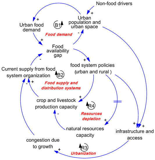 Systems analysis of food supply and distribution system (FSDS) adapted from [106]. Each labeled loop indicates an individual flow of information and/or materials. Well-known systemic structures, or archetypes, can be identified considering synergistic actions of the loops: drifting goals (B1 and B2); fixes that backfire (B2 and R3), and limits to growth (B2 and R4), where natural resources capacity represents the system-carrying capacity.