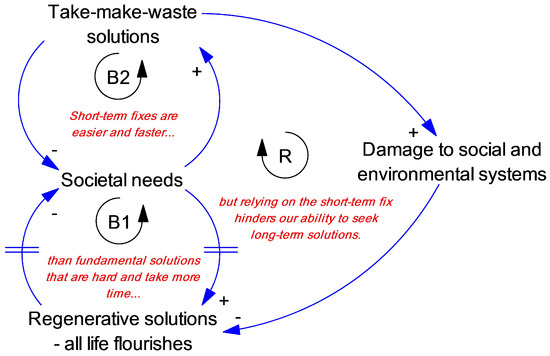 Within SD modeling, archetypes are not unrelated [127,128]. We find that AGNR problems, based on the above cases, are on a path to falling into the common trap known as shifting the burden (Figure 11). The shifting the burden archetype is characterized by two balancing loops (similar to drifting goals) embedded within a reinforcing loop (similar to fixes that backfire). One loop captures a long-term solution to alleviate a chronic problem (e.g., meet societal needs for food and fiber production through regenerative solutions that protect biodiversity and enhance soil and water resources; B1 in Figure 11). Another loop captures the “quick-fix” solution (e.g., reliance on capitalizing easily attainable resources without regard for any social or environmental externalities; “take-make-waste” within B2 of Figure 11). The “quick fix” also represents lowering the overall sustainability goal (i.e., content with “take-make-waste” alternatives since they are generally faster and cheaper). The trap of shifting the burden lies in the unintended consequences (i.e., R loop in Figure 11), where reliance on short-term solutions are reinforced through unintended consequences on social systems (e.g., sunk costs which reduce management adaptability) and environmental systems (e.g., degraded ecosystems that lengthen restoration times and overall productivity). These short-term actions are often based on erroneous assumptions (e.g., infinite and cheap energy; non-limiting waste disposal capacity; non-limiting water and soil; stronger environmental resilience; etc.) [129]. In order to formulate effective policies that support fundamental solutions in the long term, supporting systemic perspectives and testing proposed strategies with tested models and scenarios of future behaviors will require collaborative approaches, where system researchers and stakeholders work together to identify and implement sustainable strategies [129,130]. Although our review has focused on examples of discipline integration through SD modeling, readers interested in stakeholder outreach and participation and how SD can provide aid in the decision-making process are encouraged to see [130].