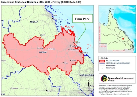 - QGSO. Queensland Statistical Divisions (SD), 2006—Fitzroy (ASGC Code 330); Queensland Government Statistician’s Office: Brisbane, Queensland, Australia, 2012.