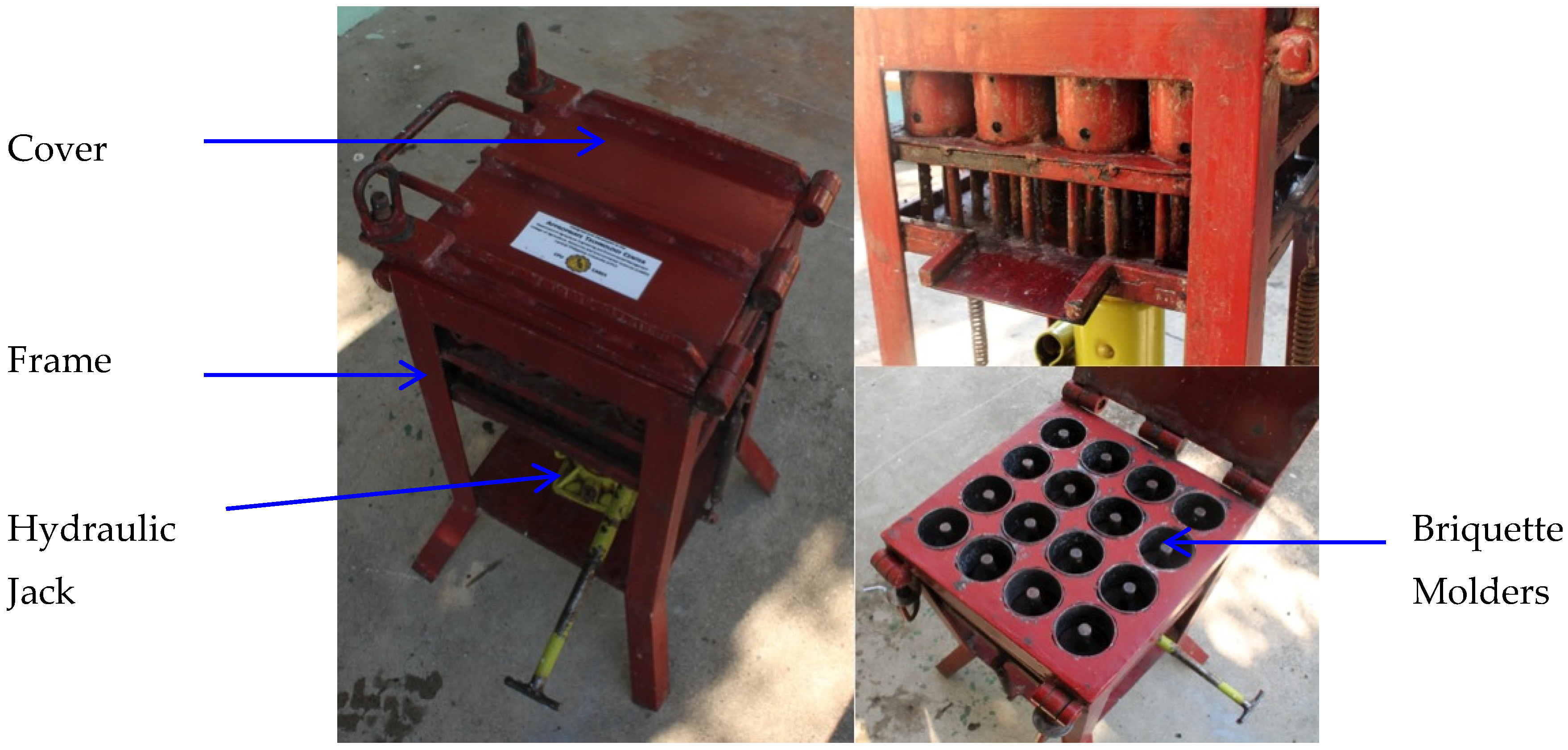 - Romallosa, A.R.D. Technical and Economic Evaluation of the Designed Jack-Driven Briquetting Machine. A Research Report; University Research Center, Central Philippine University: Jaro, Iloilo City, Philippines, 2014. [Google Scholar]
