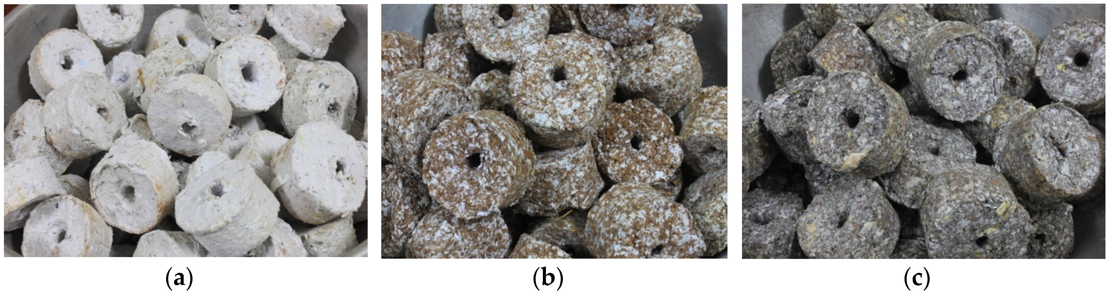 Table 1 and Figure 5 display relevant facts and quality parameters of briquettes produced using three different input materials obtained from the municipal waste stream. They were cylindrical in shape with a hole at the center. The briquettes in the first column appeared mostly white because these briquettes were produced from waste papers as the only input material of this fuel. The briquette types shown at the center of Figure 1 were light brown in color with traces of white spots. This appearance was due to the presence of 50% waste paper and 50% sawdust. In the third column, the presence of CRH resulted in a darker color of the briquette, but waste paper components can still be recognized as white and light brown color specks.