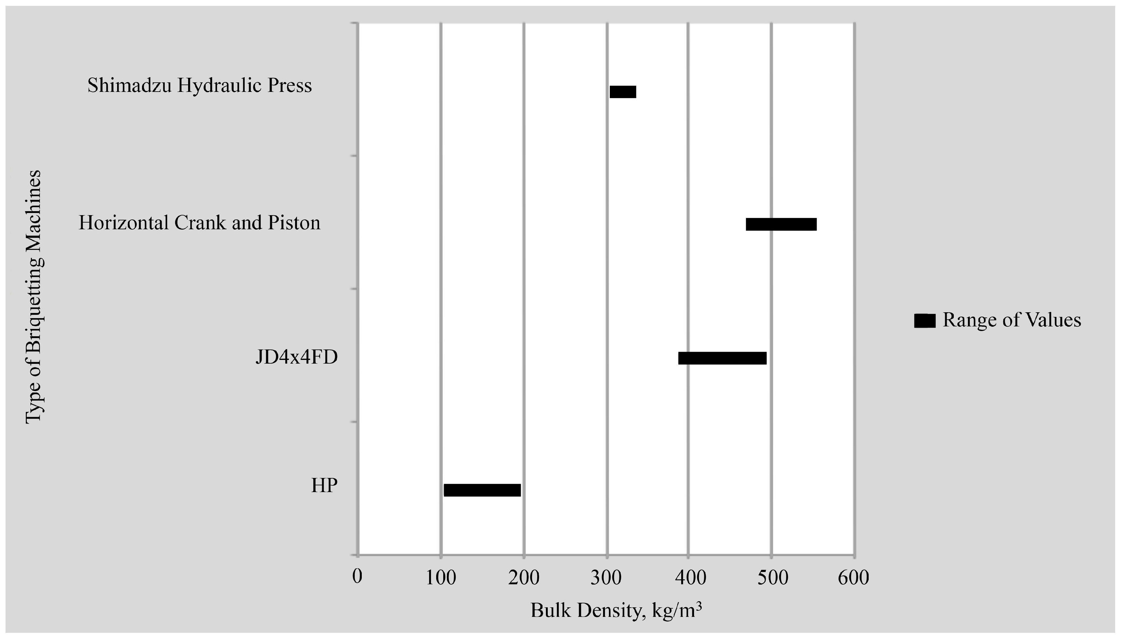 Likewise, the bulk densities produced were numerically similar to the results of the studies conducted [24,41], which produced fuels made from agricultural, forest-origin biomass; and waste paper using horizontal crank-and-piston briquetting press (values ranged from 469 to 542 kg/m3) and a Shimadzu hydraulic press (value reported to be 0.32 g/cm3 or 320 kg/m3). The comparisons are clearly illustrated in Figure 6 where JD4×4FD refers to the finalized design of a four by four jack-driven briquetting machine while that of HP is the hand-press molder.