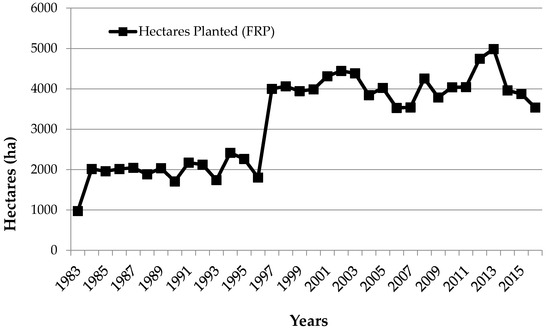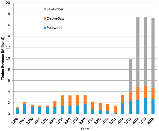 Data for this study were acquired from the FRP records of replanted area obtained from the SCFC for the time period 1983–2015 [58]. Using the yields and management regimes from Table 1 and Table 2, timber production by product (pulpwood, chip-n-saw, and sawtimber) attributed to FRP reforestation was calculated by year. This resulted in timber production by year for FRP reforestation area under the pine plantation management regime and the natural regeneration management regime. Timber production by the natural regeneration regime was subtracted from that of the plantation regime, resulting in incremental timber production by year for the FRP forest area. Figure 1 shows the hectares planted beginning in 1983 and Figure 2 represents incremental timber production on FRP reforestation area by year. Figure 2 begins with 1998, the first year that timber harvest occurs on these plantations. These timber harvest volumes were then multiplied by the estimated south-wide average annual stumpage prices for 2015 [59]. For years after 2015, timber prices were assumed to remain constant. The resulting incremental timber revenue by year represented in Figure 2 is presented later in the Results section.