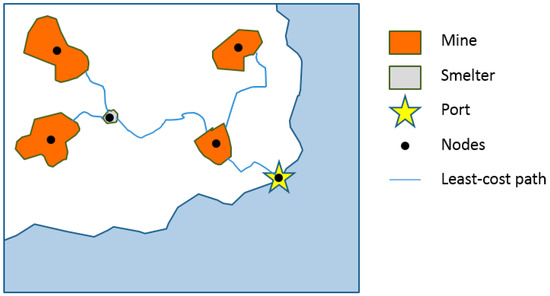 Industrial-scale mining projects require much infrastructure planning, and “resource corridors” of development have been highlighted as a result of such projects [10]. The scale of the planning for such projects can have a transformative impact on development beyond just the mining itself, as demonstrated by notable development projects, particularly in Africa [11]. An important consideration for developing a mine or multiple mines in a region is to optimally plan for linear mining infrastructure including roads, rails, and power lines linking mines to electricity generators, processing (e.g., smelters), and transport facilities (e.g., ports).