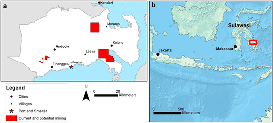 (a) Current and potential mining locations (based on mine lease areas) and port and potential smelting facilities used as nodes to be linked by infrastructure; (b) Island of Sulawesi, Indonesia, with the study area in outlined in red (spatial data from http://www.naturalearthdata.com).