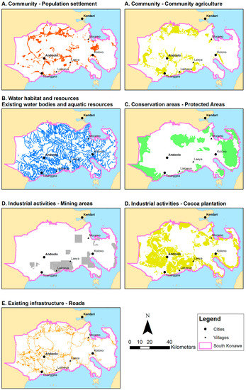 Maps of the sub-factors used to create a cost-surface based on Geographic Information Systems (GIS) spatial data. Each subfactor (A–E) is represented by one or more spatial dataset (see Table 1).