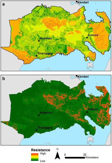 Example of the cost-surface produced through (a) combining all the weighted GIS layers representing each of the sub-factors where spatial data was available for local regions and (b) using only topography where high resistance areas have higher slope values.