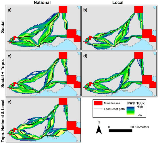 Infrastructure corridors identified with least-cost path and corridor analysis for national and local groups (a–d); (a,b) Pathways and corridors identified where the resistance surface is based only on social values; (c,d) Pathways and corridors identified where the resistance surface is based on a combination of topography and social values; (e) Pathways and corridors identified only where the resistance surface is based on topography. Corridor width is based on a cost weighted distance (CWD) threshold of 100,000 m. Additional analysis based on the cost-weighted distance of 50,000 m is not shown, but is analysed in Table 2.
