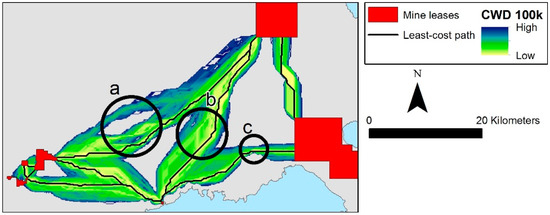 Figure 6 highlights specific characteristics of the cost-weighted distance corridors that are useful for planning infrastructure corridors. In some cases, there are alternative pathways for routing (Figure 6a), which are separated by high resistance topographical and social values. In other cases, the cost-weighted corridor is wide and the cost-weighted distance values are relatively homogenous, indicating multiple options for routing that are equally as feasible (Figure 6b). In these areas, the resistance surface is likely to be relatively homogenous. In other cases, the cost-weighted corridor widths are narrow, indicating fewer options for routing (Figure 6c).