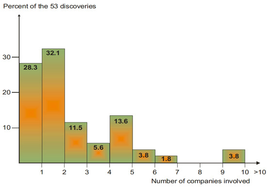 The number of companies involved from the start of exploration to its successful conclusion for 53 base-metal and precious-metal discoveries in the Circum-Pacific Region (after [21,22]).