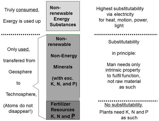 Since, in the above, we consider energy and fertilizer resources to be the most important natural resources categories, one might wonder why we did not consider the aspect of the different energy intensities of fertilizer resources, but rather focused only on geological availability. Indeed, nitrogen fertilizer produced from nitrogen in the air via the Haber–Bosch-synthesis requires much more energy than phosphate or potassium fertilizer produced mostly from rock deposits via mining and benefication. The reason is this: with the changeover to renewable energies due to the “Energiewende”, the changeover to renewable energies, discussed below in Section 6 and Section 7, energy loses its overall importance. This is why we propose a new hierarchy of natural resources in Section 7.